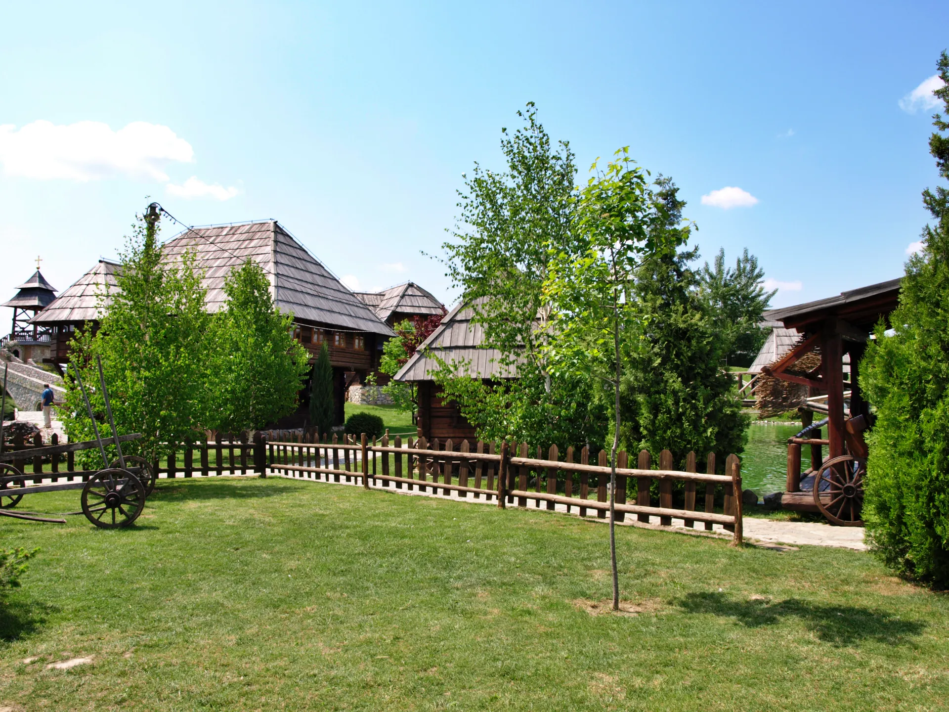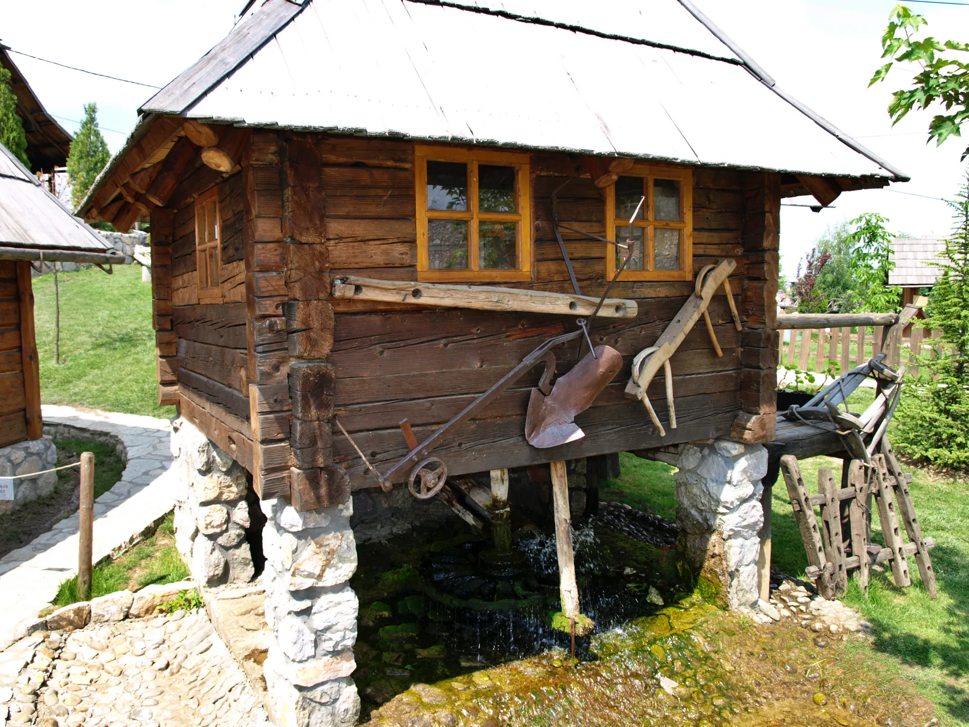 V vasi lahko popotnik opazuje delovanje več mlinov, mlekarne in izdelavo mlečnih izdelkov, kovačije, kamniti studenec in skedenj. Mlin iz leta 1937 je še vedno v uporabi, kot tudi mlin iz leta 1917, v katerem občasno zmeljejo moko za mafine, ki jih nato postrežejo v restavraciji. V notranjosti mlina je vse kar je potreboval mlinar za prebivanje med sezono mletja žita. Majhna mlekarna iz leta 1948 prikazuje predelavo mleka in skladiščenje mlečnih izdelkov z avtentičnimi lesenimi policami. Mlekarna je morala biti dobro prezračena in čista v njej pa so lahko delale samo ženske. Lesene koče pripadajo dinarskemu tipu arhitekture z visoko streho. V omenjeni vasi se v nekaterih kočah lahko tudi prespi, saj je vse skupaj zamišljeno kot apartmajsko naselje. Apartmajske lesene koče so zunaj avtentične, notranjost pa je prilagojena sodobni bivalni kulturi. V eni od hiš je trgovina s spominki v kateri ponujajo izdelke starih domačih obrti. Vas se nenehno razvija, zato se nekatere koče še v gradbeni fazi, prikazati pa nameravajo tkalnico in lončarsko delavnico. Tematska celota duhovnega življenja popotnika popelje še globlje v preteklost in jo sestavljajo replike verskih objektov iz različnih krajev pravoslavnega dela Bosne.