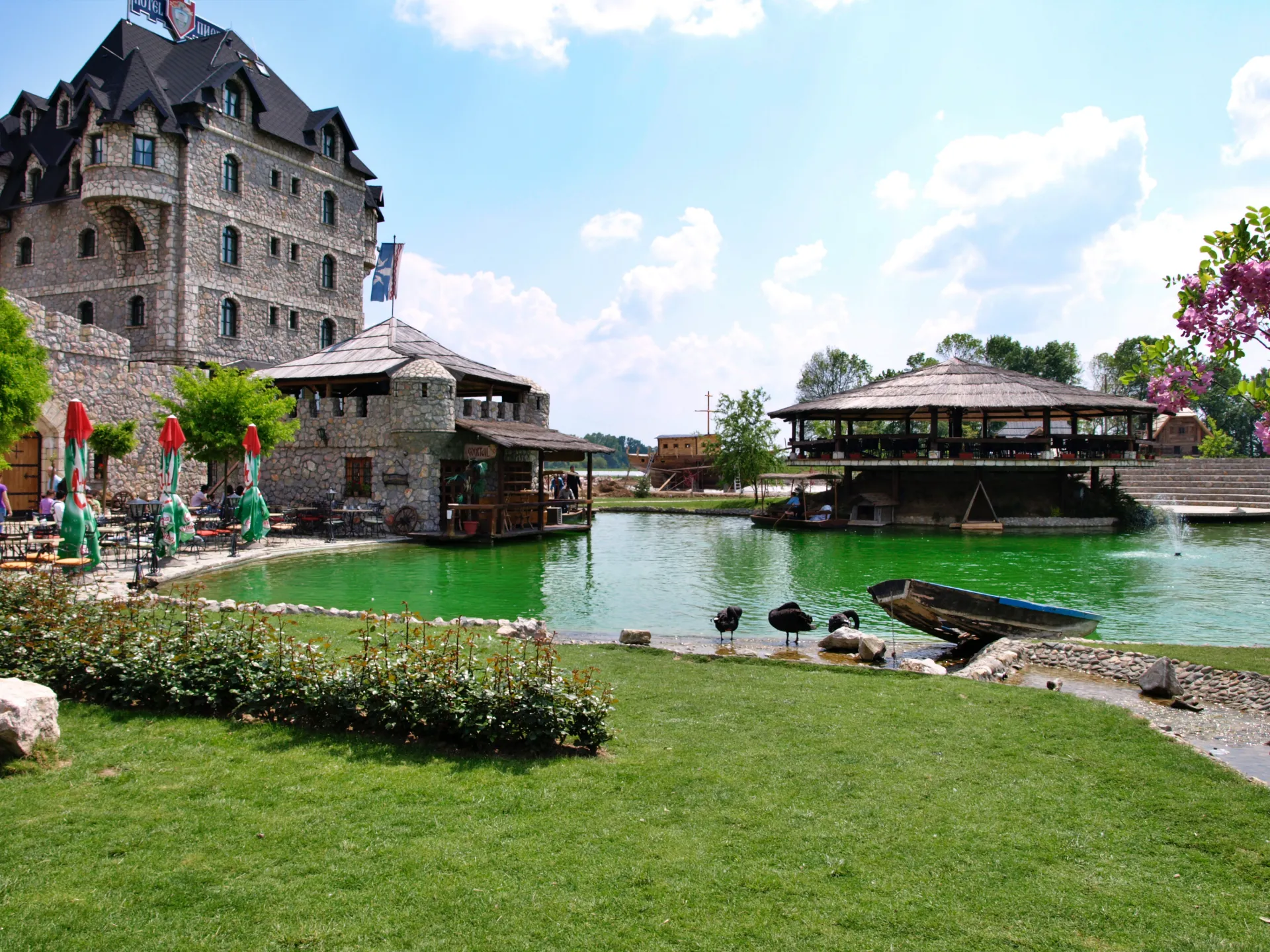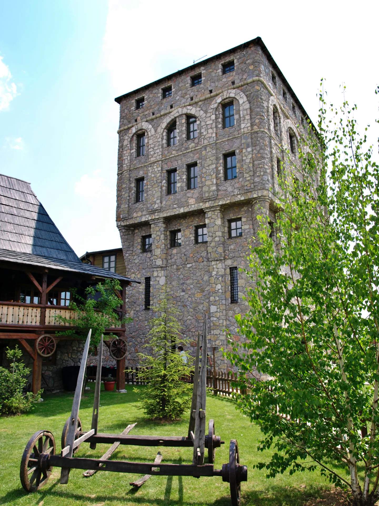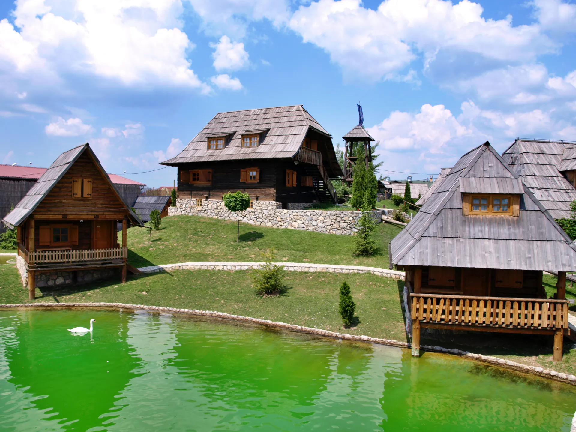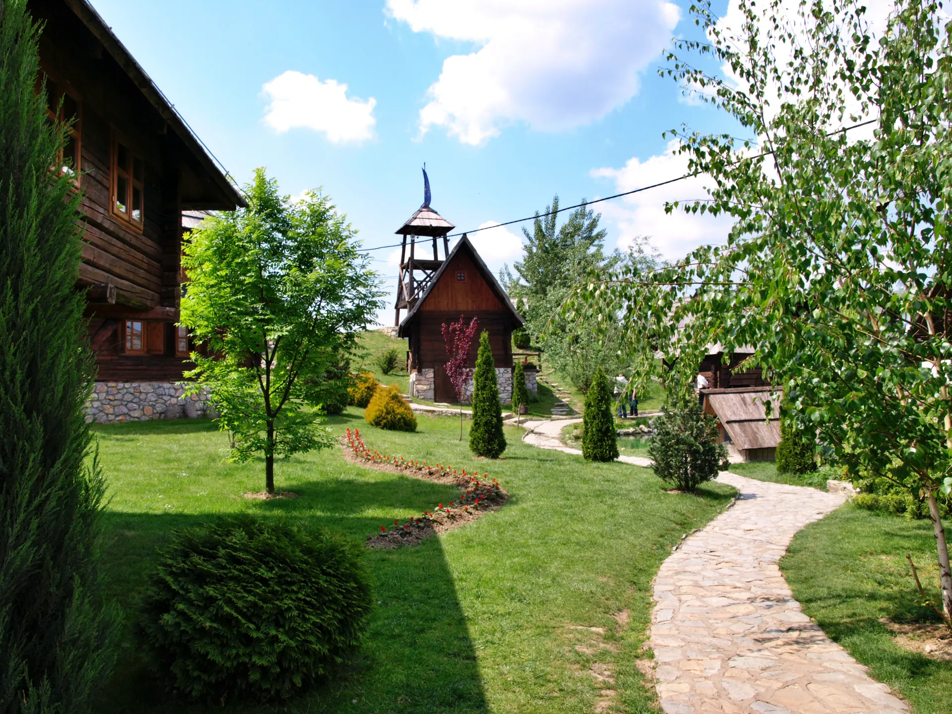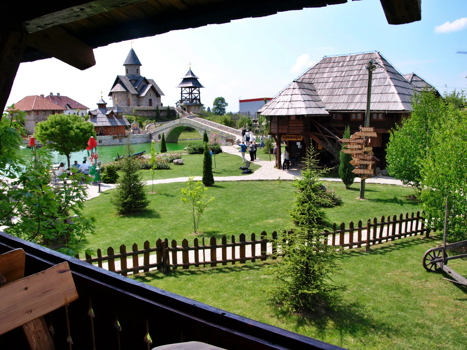 Posvetni del vasi je povezana z velikim kamnitim mostom, ki je replika ˝Kozje čuprije˝ v Sarajevu. Preko mostu pot vodi k lični cerkvici s krstno vežico, osrednji del tega dela pa predstavlja samostan ˝Svetog oca Nikolaja˝, replike samostana iz Kumanice, ki so ga zgradili Nemanjići. V njej lahko občudujete relikvije Cara Uroša in Svetog oca Nikolaja. Poleg samostana je samostanska hiša (Konak), ki je izjemen primer srednjeveške gradnje. V bližini samostanske hiše ob jezeru je kamniti amfiteater s 380 sedeži, primeren za kulturne prireditve na prostem. Vse skupaj je čudovito urejeno in dopolnjeno s popolno ponudbo več restavracij z odlično in cenovno ugodno hrano ter ponudbo prelepega kamnitega hotela v srednjeveškem stilu. Po vasi se je možno popeljati s kočijo, poskrbljeno pa je tudi za najmlajše, ki se bodo razvajali v posebnem parku z igrali kot so trampolini in tobogani. Skratka zadeva je prekrasna in definitivno priporočam ogled.