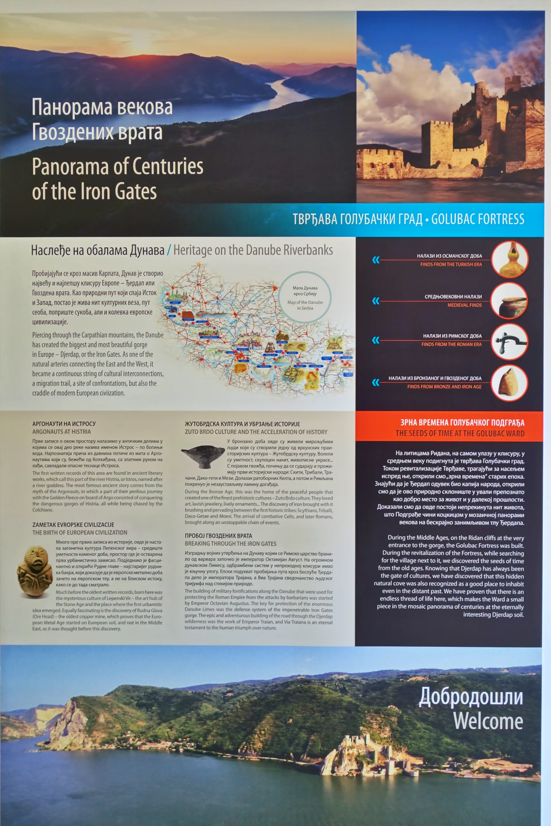 Reka Donava je prežeta s čudovito naravno in izjemno kulturno dediščino, za ljudi ob njenem nabrežju pa je vedno predstavljala vir življenja. Tako reka, ki je oblikovala eno najbolj očarljivih pokrajin že stoletja velja za zibelko kulture in civilizacije. Za svoja potovanja so jo uporabljali mnogi cesarji in kralji, po njihovih sledeh pa je danes mogoče občudovati samostane in razkošne gradove ter čudovita srednjeveška mesta. Eno od takšnih srednjeveških mest ob Donavi, ki je vsekakor vredno obiska je tudi znameniti Golubac v Srbiji, ki je nastal kot branik v Džerdapsko sotesko, znan pa je po svoji čudoviti trdnjavi oz. gradu (tvrđava Golubački grad). Pri omenjenem mestu reka zapusti Panonsko nižino, njen širok in umirjen tok pa se prepusti ozki in visoki Džerdapski soteski z mnogimi meandri. Gre za največjo in najdaljšo sotesko v Evropi, ki ji mnogi pravijo tudi Železna vrata, njene stene pa se nad Donavo dvigajo tudi do 800 m.n.m.
