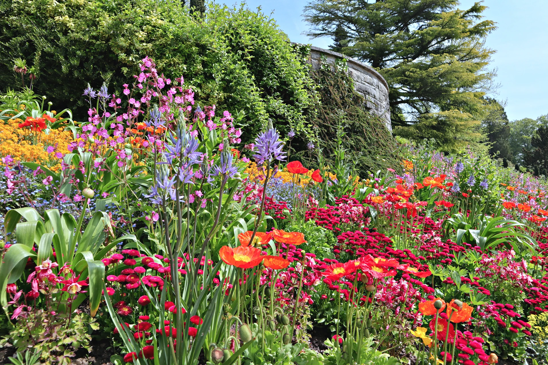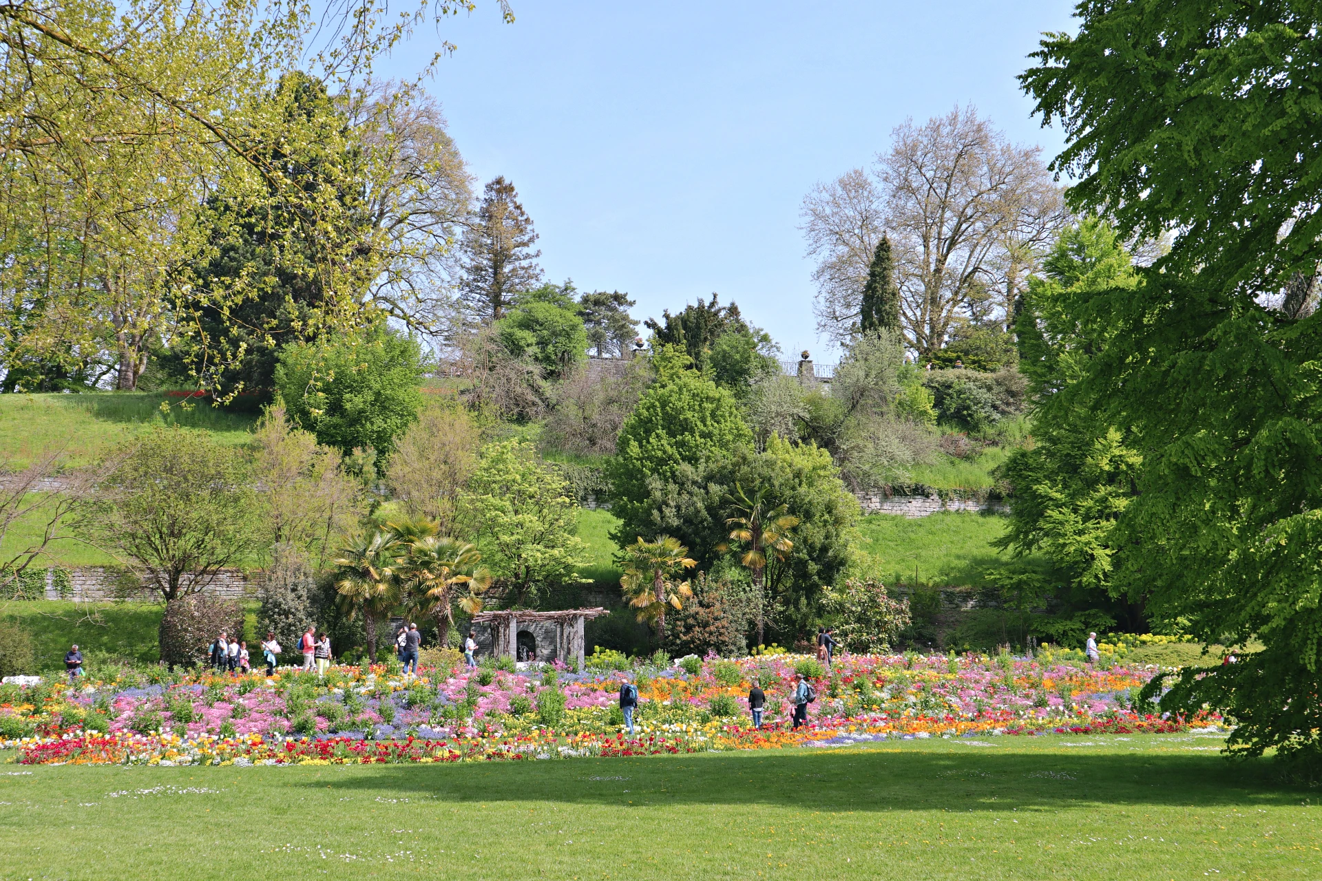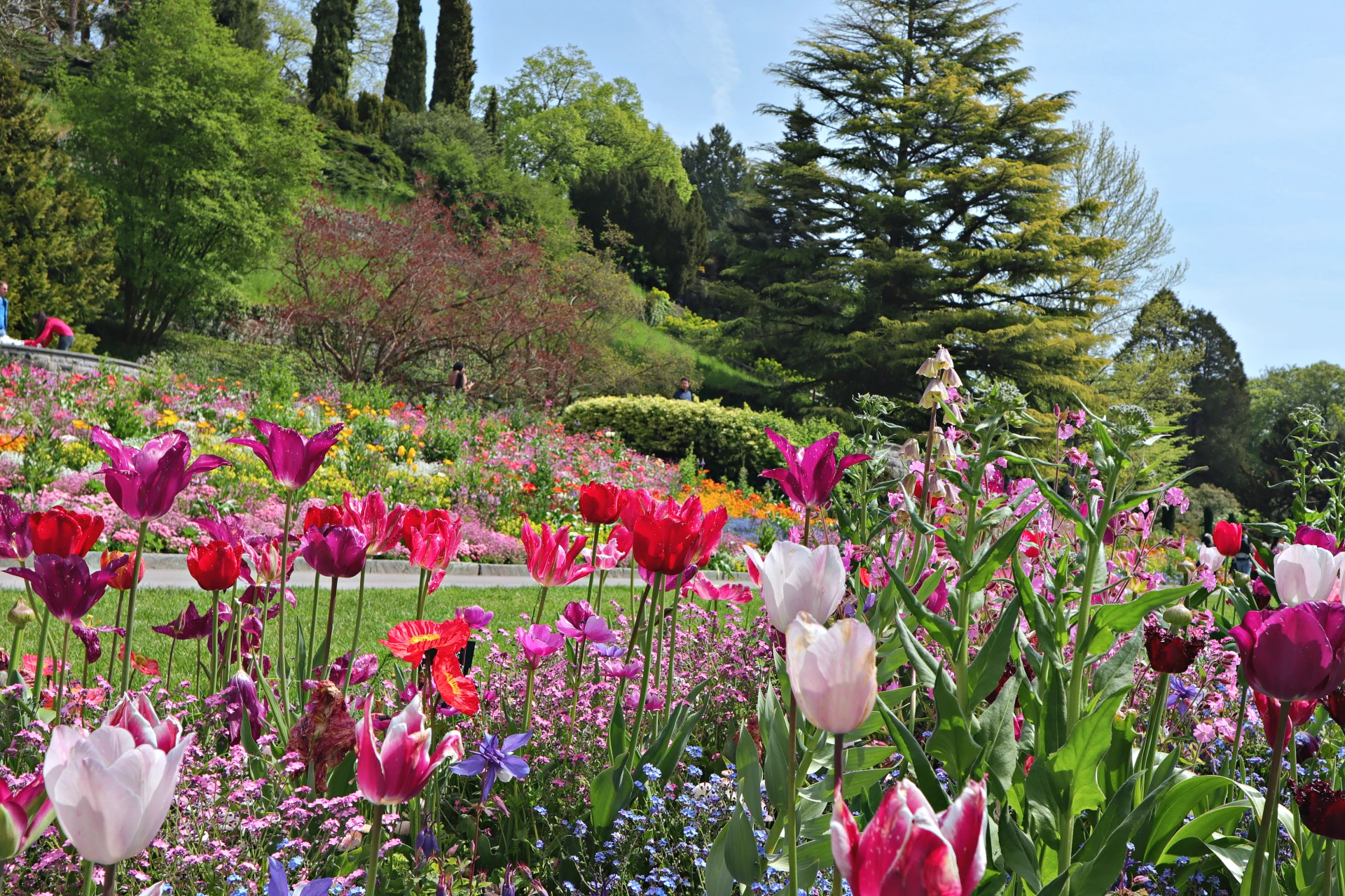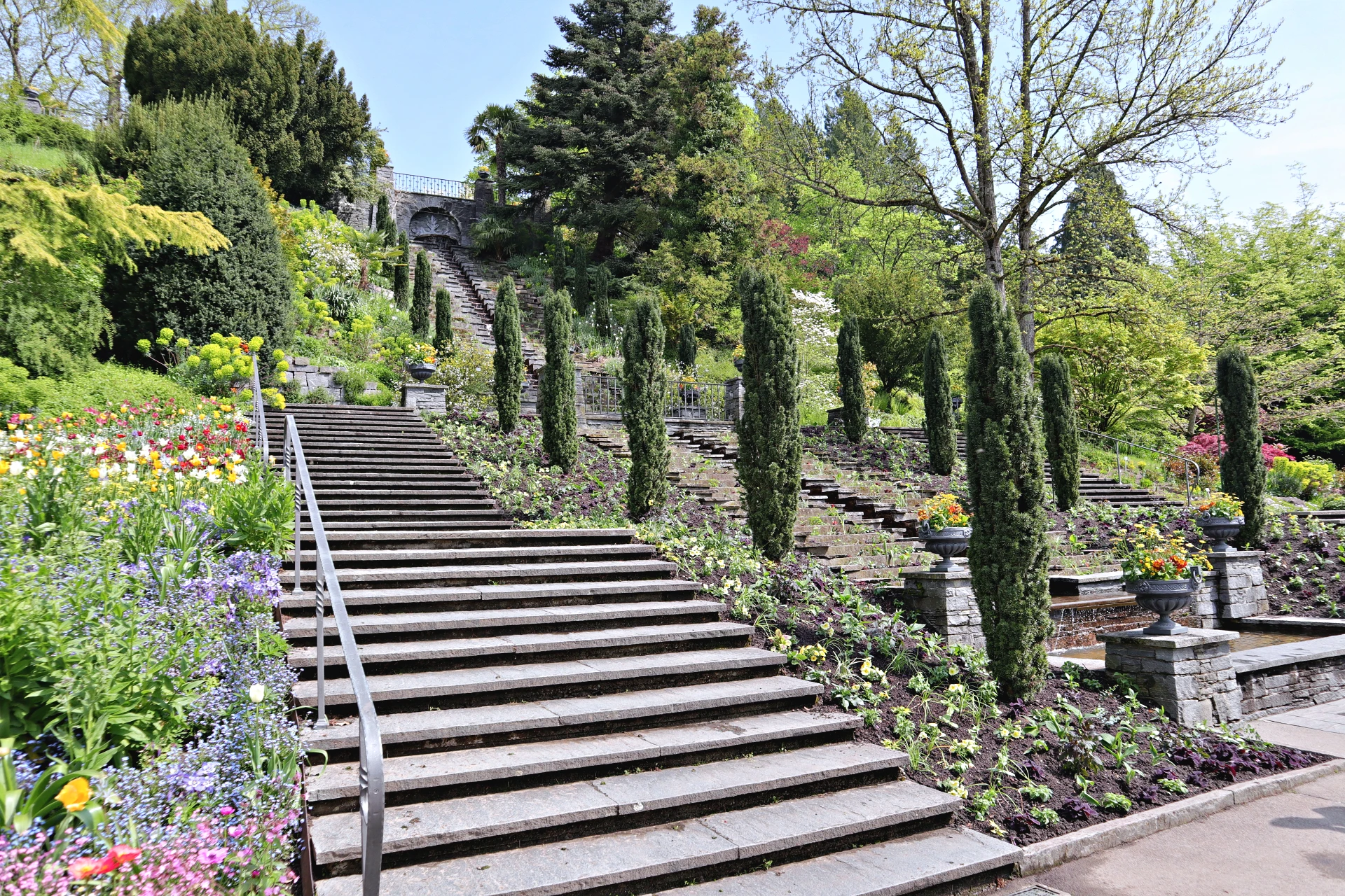 Znamenitosti otoka niso razporejene kot točke na zemljevidu, temveč kot premišljena poglavja zgodbe, ki jo obiskovalec odkriva počasi, z občutkom. Sprehod po otoku deluje kot listanje po živi botanični enciklopediji, kjer vsaka pot, vsaka zgradba, vsaka terasa in vsak drevored razkrivajo novo plast lepote. Tukaj se čuti, da prostor ni nastal naključno, temveč z vizijo – povezati arhitekturo, zgodovino in rastlinski svet v enotno doživetje. Spomladi se otok prebudi v eksploziji barv. Več kot milijon tulipanov, narcis, hijacint in spominčic ustvari prizor, ki ga je najlepše doživeti ob sprehodu po Pomladni aleji, kjer se cvetlične gredice razlivajo kot barvni valovi. Maja in junija prevzamejo oder rododendroni in azaleje z več kot 200 sortami, poletje pa zaznamuje kraljestvo vrtnic. V Italijanskem rožnem vrtu uspeva več kot 1.200 sort, med njimi stare zgodovinske vrtnice in sodobni hibridi. Italijansko rožno stopnišče s kaskadami vode, pergolami in simetrično zasnovo ustvarja prizor, ki ga številni obiskovalci opisujejo kot skoraj filmskega. Jeseni Južni vrt zažari v barvah okoli 20.000 dalij iz približno 250 sort, medtem ko zima otok umiri v bolj zadržano, meditativno podobo.