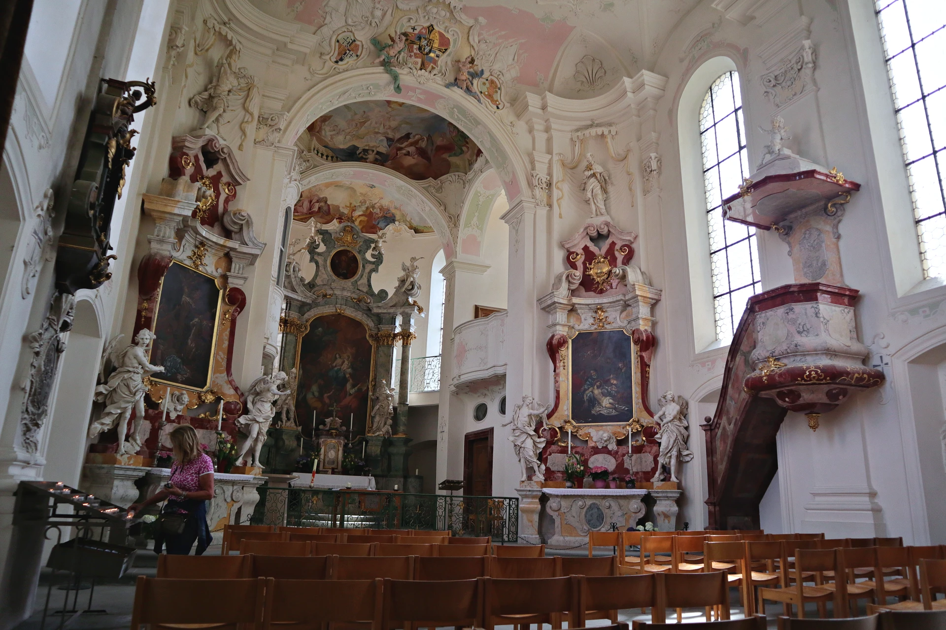 Njegova svetla fasada in arhitekturna harmonija ustvarjata elegantno kuliso, ki jo dopolnjuje cerkev Sv. Marije. Grad in cerkev s svojo jasno arhitekturo tvorita veličasten in harmoničen baročni ensemble, ki velja za edinstven primer južnonemškega baroka in sta od leta 2003 zaščitena kot kulturni spomenik. Cerkev Sv. Marije so jo zgradili nekoliko prej, med letoma 1732 in 1739, prav tako po načrtih Johanna Casparja Bagnata. Velja za Bagnatovo prvenstvo med njegovimi številnimi cerkvenimi stavbami in pomeni začetek oberšvabskega visokega baroka. Sredozemske terase z agavami, palmami in bugenvilijami dodajo otoku pridih juga. Od tu se odpirajo široki razgledi na jezersko gladino, kjer se svetloba spreminja skozi dan in ustvarja neprestano igro barv. Prav ta kombinacija natančno oblikovanih vrtov, tropskih rastlinjakov, zgodovinske arhitekture in naravnih panoram daje otoku značaj celostnega doživetja.
