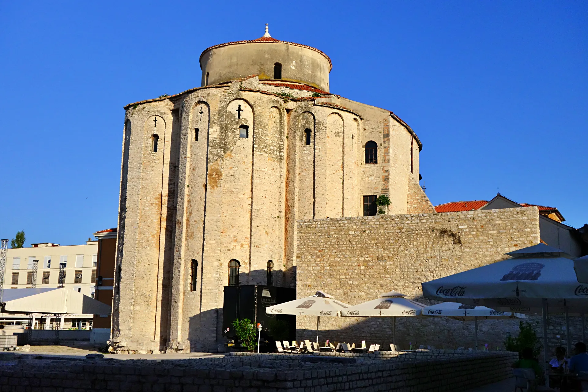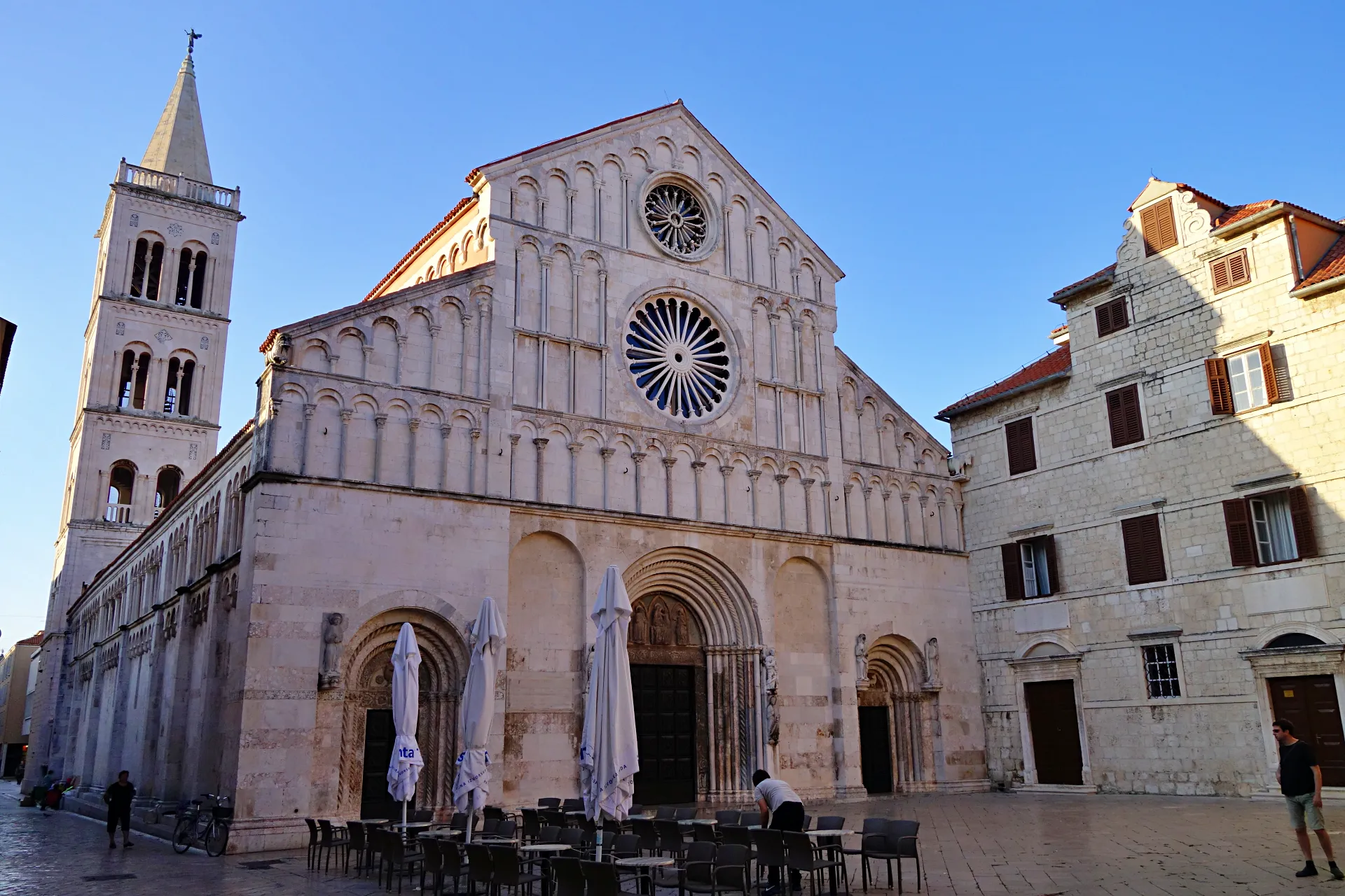 Zanimiva je tudi zadrska katedrala posvečena sv. Štosiji, katero pročelje okrašujeta dve čudoviti okni v obliki rože. Portali imajo značilen romantični stil, njen zvonik, ki je zgrajen že v poznem srednjem veku, pa mogočno dominira na zadrski veduti. Malo naprej se nahaja cerkev sv. Marije, ki pripada ženskemu benediktinskemu samostanu sv. Marije. Leta 1066 ga je ustanovila Čika (Chicca), pripadnica znane in vplivne zadrske plemiške rodbine Medijevcev, ki je bila tudi prva predstojnica samostana. Ta je na mestu nekdanje neugledne cerkve dala zgraditi troladijsko cerkev, njena hči Vekenga pa je v začetku 12, stoletja zgradila kapitularno dvorano in monumentalni zvonik. V samem samostanu se nahaja grobnica redovnice in prej omenjene Vekenge, njegov arhiv pa hrani izjemno vredno zbirko spisov iz 11. stoletja v katerih so omenjeni nekateri hrvaški kralji. Pročelje cerkve in njen južni bočni zid, kakor tudi glavni portal so v renesančne stilu, na zvoniku pa je zapis v spomin ogrskemu ter hrvaško-dalmatinskemu kralju Kolomanu, potomcu ogrske dinastije Arpadovičev, ki je v mesto prispel leta 1102. Če se prehodite še naprej proti zahodnim mestnim vratom na severni strani obzidja oz. proti tako imenovanim ˝Morskim vratom˝ iz sredine 16. stoletja pridete do zanimive triladijske cerkve sv. Krševana s polkrožno apsido, ki je nekoč pripadala moškemu benediktinskemu samostanu. Zgrajena je v stilu romantike in je leta 1175 posvečena zaščitniku mesta in mučeniku sv. Krševanu. Pročelje cerkve je sicer povsem enostavno in nima nobenih okrasov, izjema pa je glavni portal. V notranjosti je lep oltar iz leta samega začetka 18. stoletja z čudovitimi kipi iz belega marmorja. Nasploh je v Zadru precej cerkva, bazilik in samostanov, njihova arhitektura pa navduši vsakega obiskovalca. Nadvse zanimivi so tudi sami trgi, med katerimi je vsaj zame eden najlepših ˝Narodni trg˝ s cerkvijo sv. Lovra iz 11. stoletja. Gre za izjemen trg, kjer je zbirališče mnogih kulturnikov, trg pa obdaja zgradba ˝Gradske straže˝ (Mestna straža) iz druge polovice 16. stoletja z zvonikom in uro iz 18. stoletja, ˝Gradska loža˝ (Mestna loža) iz 13. stoletja, na severu pa trg zaključuje ˝Gradska viječnica˝ (Mestna hiša) iz leta 1934.
